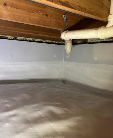 CleanSpace Liner and CleanSpace Drainage Matting were installed to fully encapsulate the crawl space with a 20 mil thick liner along the walls and floor of the dirt crawl space.